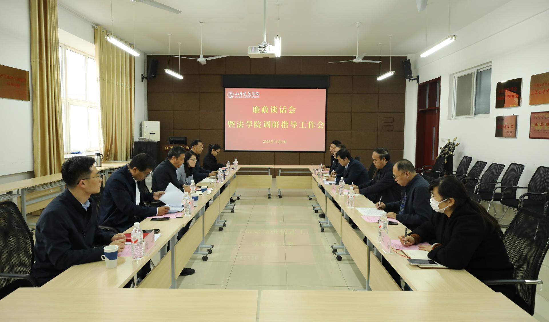 为深入贯彻落实全面从严治党要求,压紧压实管党治党政治责任,进一步加强党风廉政建设,同时精准把握学院发展实情、破解发展难题,11月6日,学校党委书记王伟在长清校区交通法学院主持召开了廉政谈话会暨交通法学院调研指导工作会。学校党委委员、党委组织部部长王兴盈,党委办公室、纪委、党委组织部、党委宣传部、党委统战部负责同志,交通法学院全体党委委员参加会议。