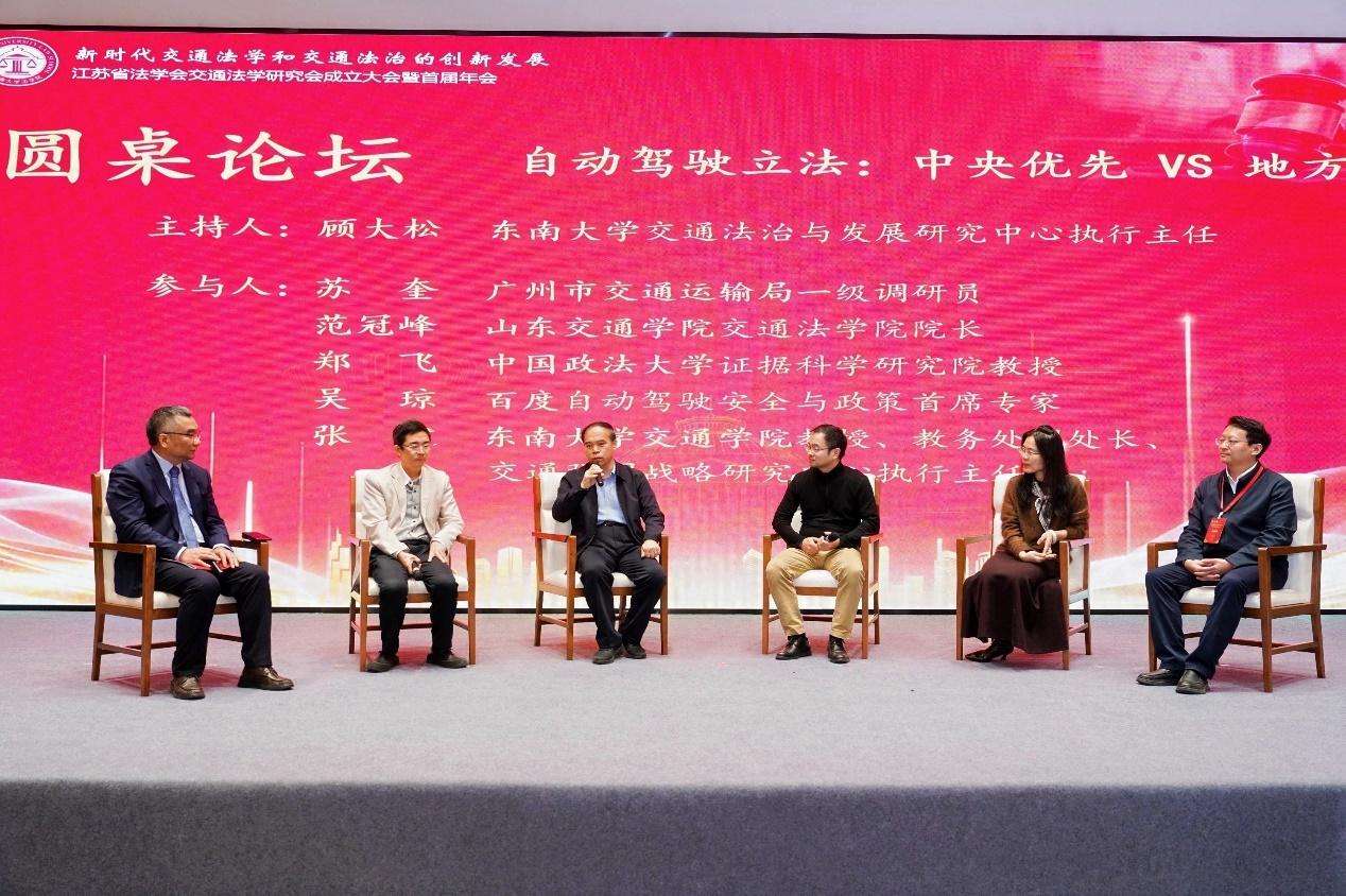 会议期间,专家学者就电动自行车事故分析、海事信用管理、交通肇事行刑衔接、低空经济地方立法、自动驾驶数据权益等热点难点问题进行了深入研讨。在圆桌论坛中,范冠峰与来自北京、广东等地的专家围绕“自动驾驶立法:中央优先VS地方优先?”展开深度对话,阐明了自动驾驶汽车领域地方立法先行先试的必要性,同时提出在自动驾驶汽车发生交通事故后的责任认定、保险设置等方面需要加快推进中央立法。