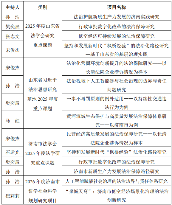 近日,交通法学院科研项目立项再获佳绩。中共山东省委政法委、中共山东省委全面依法治省委员会办公室、省法学会、省习近平法治思想研究基地、济南市法学会、济南市哲学社会科学办公室陆续公布了2025年度山东省法学会研究重点课题、山东省习近平法治思想研究基地2025年度重点课题、济南市法学会2025年度法学研究重点课题、2026年度济南市哲学社会科学规划研究项目、法治专项项目立项名单,我院共有十四项课题获批立项。项目立项名单如下: