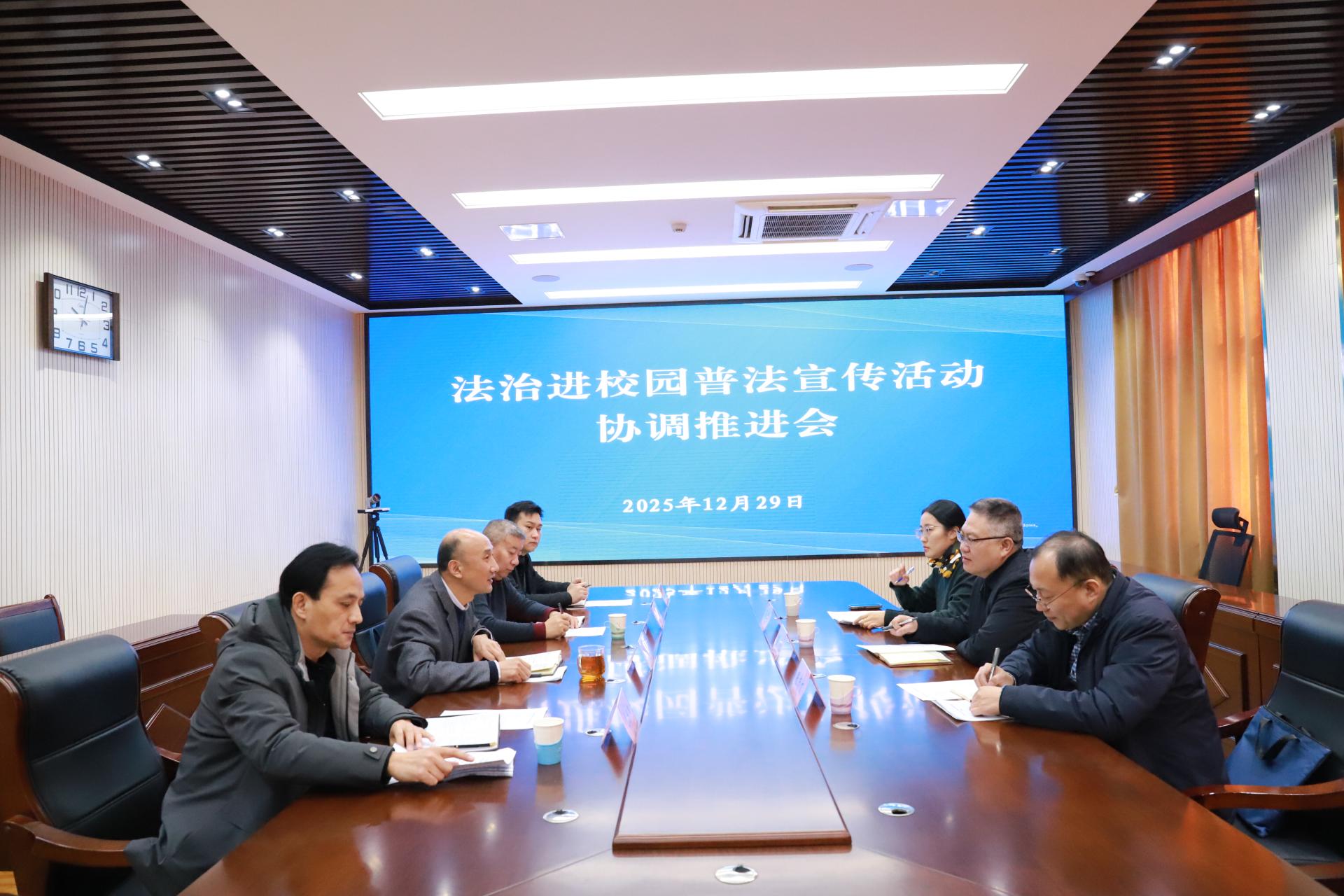 为凝聚校地协同合力,扎实推进法治进校园普法宣传工作落地落细,12 月 29 日上午,学院联合长清区委政法委、区教体局,在区综治中心信息指挥中心召开法治进校园普法宣传活动协调推进会。学院党委副书记崔晓、副院长张志文、辅导员杨程,区法学会专职副会长兼秘书长范勇,长清区委政法委办公室主任张伟以及区教体局分管负责同志参加会议,会议由范勇主持。