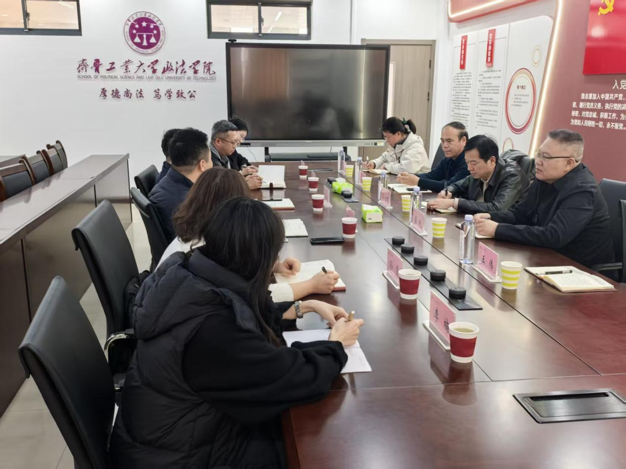 为全面提升党建工作质量,探索党建与业务深度融合新路径,进一步谋划十五五规划,推动学院高质量发展,深化校际交流合作,3月16日,交通法学院前往齐鲁工业大学(山东省科学院)政法学院开展专题调研座谈。双方党政负责人、骨干教师参加交流。